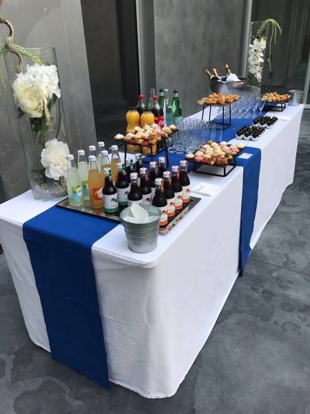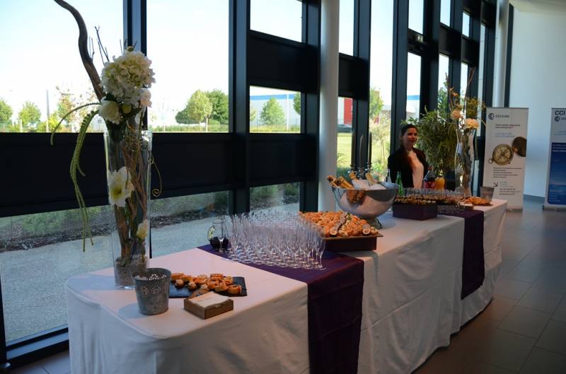 Nos buffets sont décorés de chemin de table coloré (quelle sera celle à l'image de votre entreprise ?) et de compositions florales intemporelle aux tons clairs et naturel.