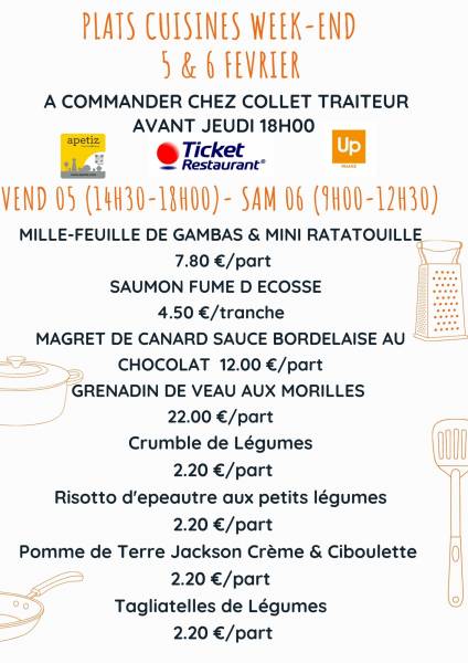 Bonne nouvelle : chaque week-end, Collet Traiteur à Louviers vous propose une sélection de plats traiteur faits maison à emporter, préparés avec soin, à base de produits frais, pour le plaisir de tous les gourmands.