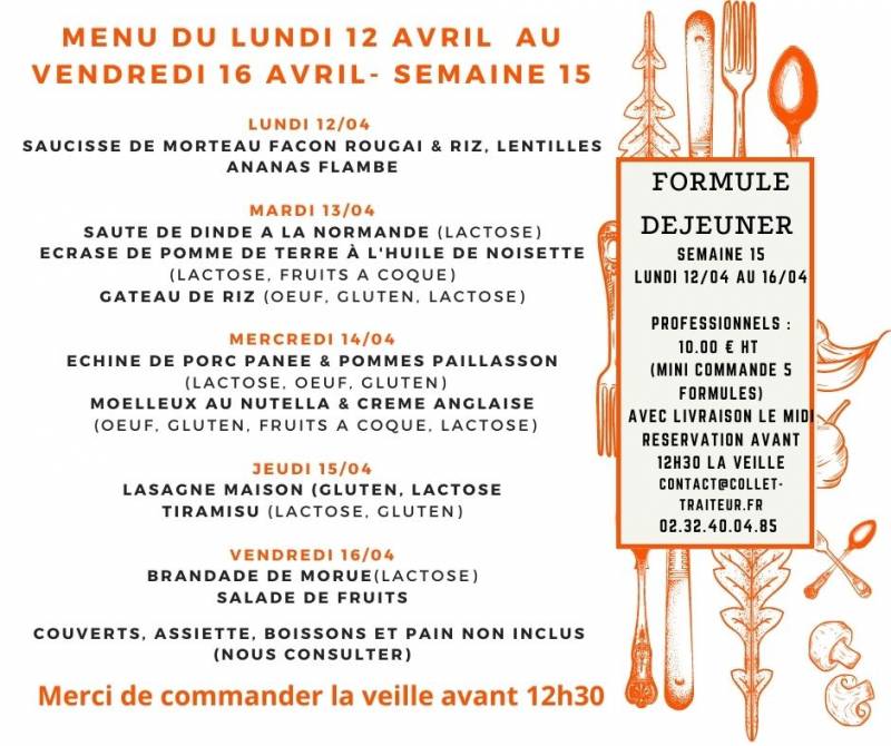 COMMENT COMMANDER : 24h00 à l'avance (pour le lundi : merci de passer commande avant le vendredi avant 12h00). Nous enregistrons vos commandes suite à une confirmation de notre part par téléphone au 02.32.40.04.85, en magasin (9h00 - 12h45 puis 14h30 à 17h00 sur le site internet www.louviers-shopping.fr, (en réglant directement en ligne), par email contact@collet-traiteur.fr, par message privé sur Facebook à la Page Collet Traiteur uniquement