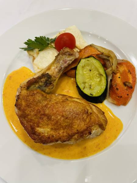 Tendre Suprême de Pintade au Jus de Poivron safrané (G, L)